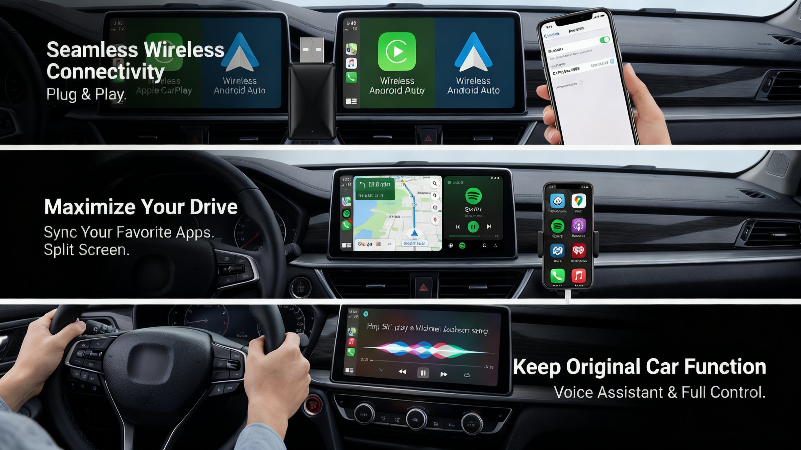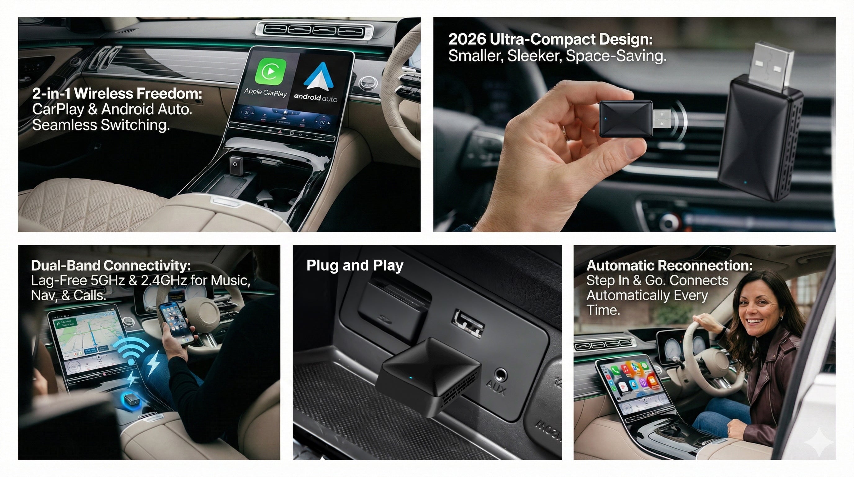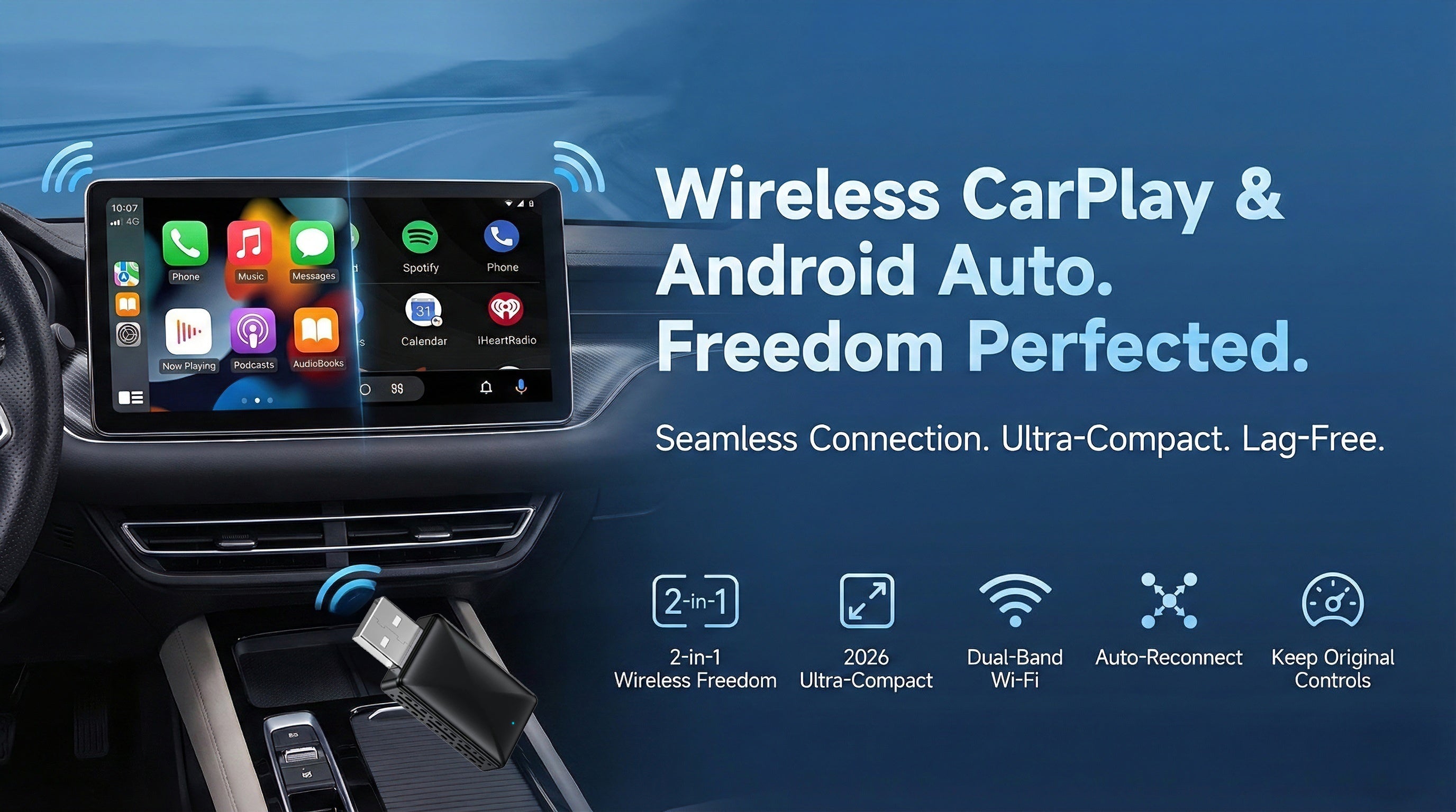 2-in-1 Wireless Freedom: Whether you drive with an iPhone or an Android, this adapter has you covered. Switch seamlessly between Wireless CarPlay and Wireless Android Auto without changing devices.